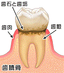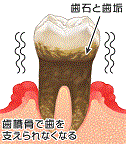 歯垢・歯石のなかに存在する歯周病菌によって歯を支えている骨や歯肉が破壊されていく病気です。